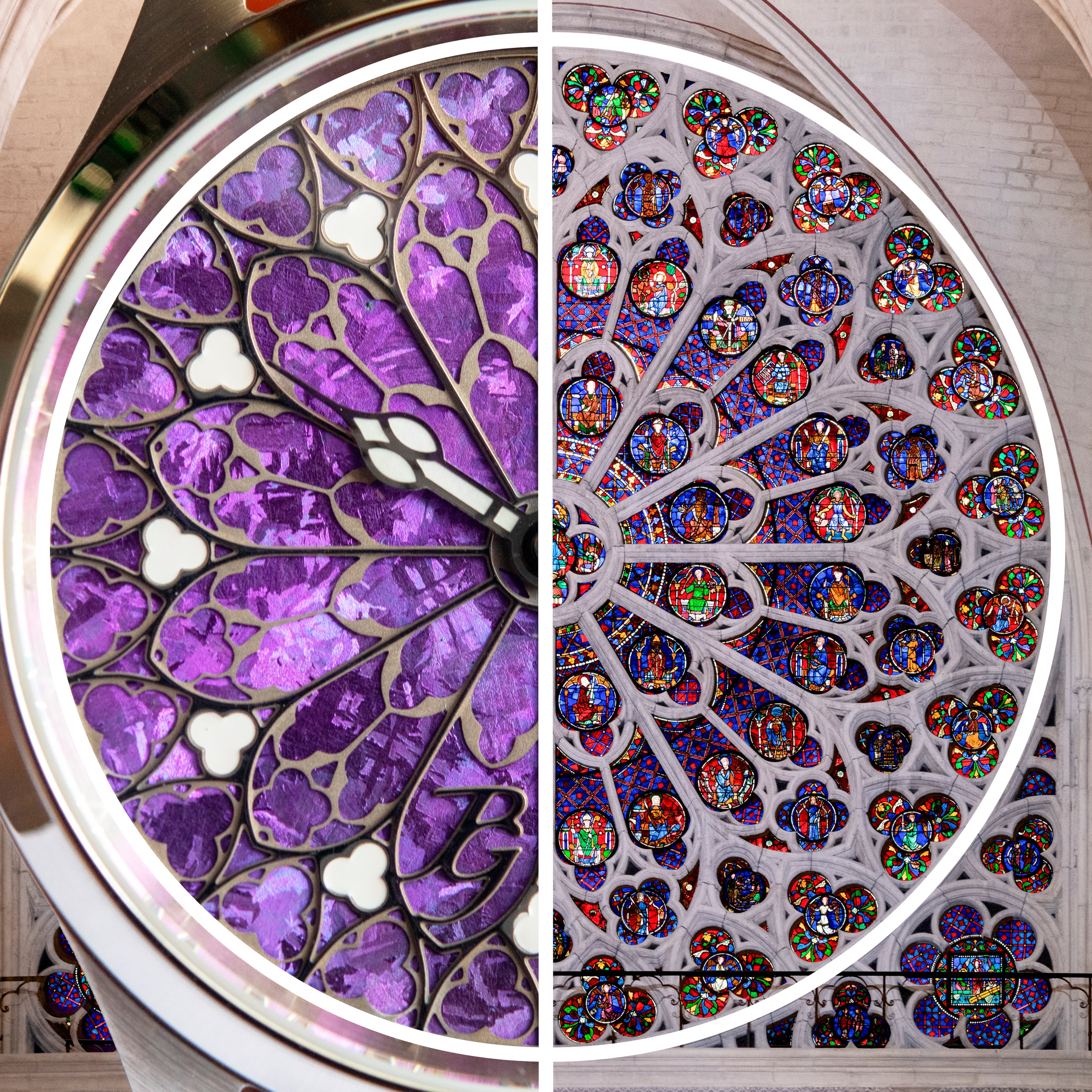 The Notre-Dame watch features an anodized titanium dial in an intense purple hue. The crystallized surface plays with light, revealing reflections in perpetual motion depending on the angle and ambient brightness, reminiscent of the interplay of light in stained glass windows.