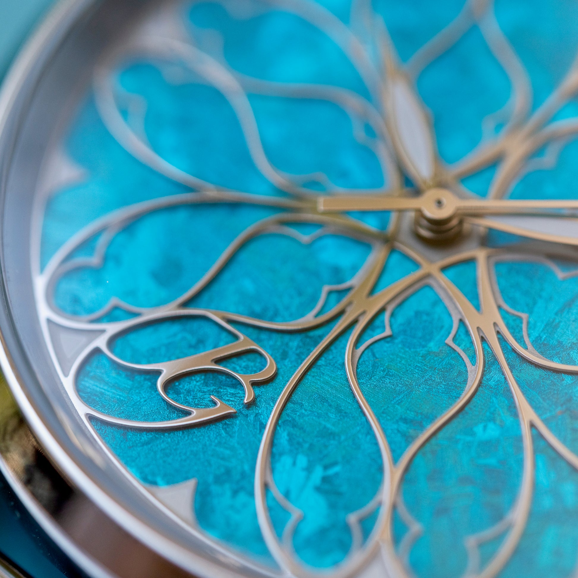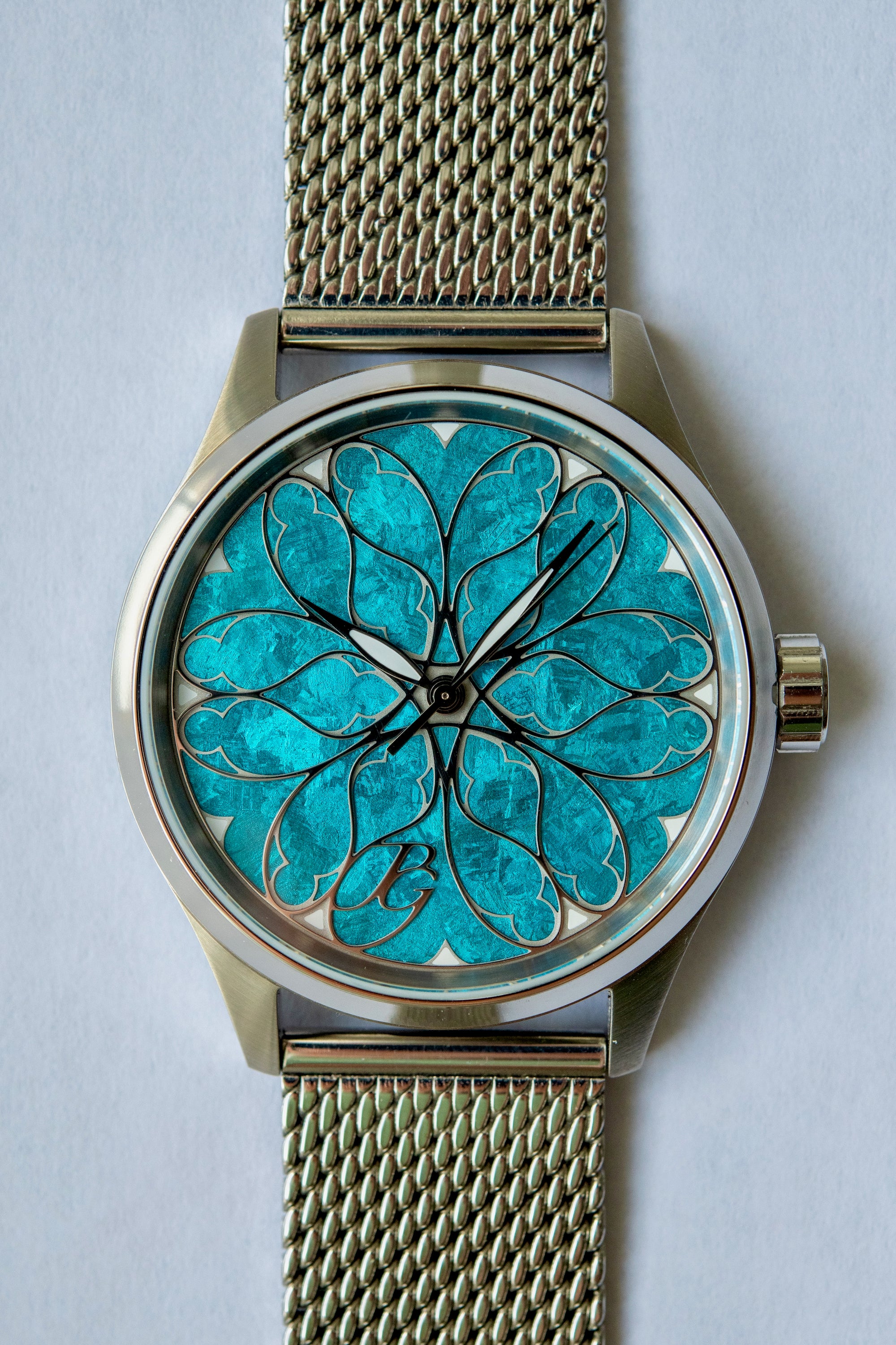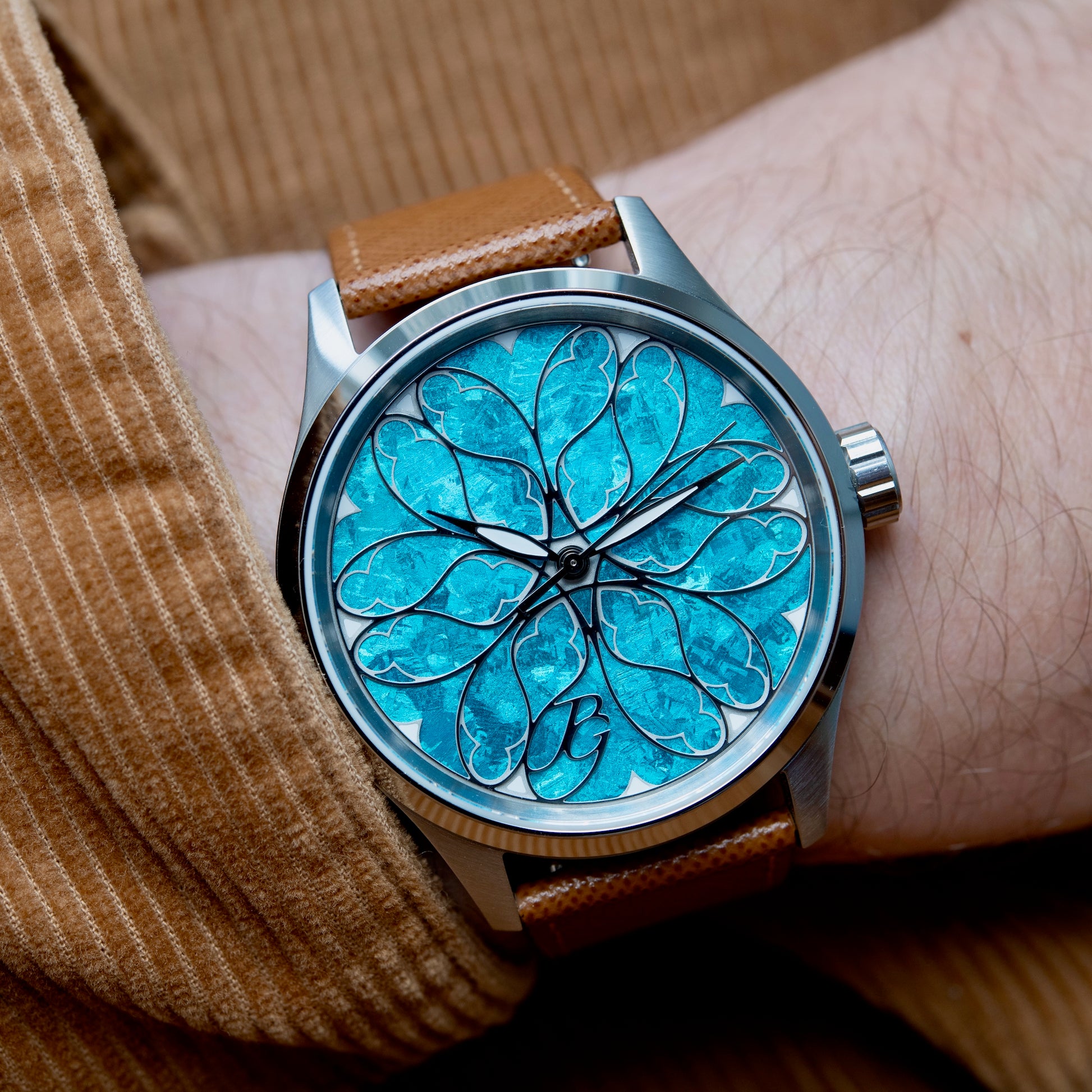 La montre Vincennes se caractérise par un cadran bleu céleste en titane anodisé. La surface cristallisée permet de jouer avec la lumière, révélant des reflets en perpétuel mouvement selon l’angle et la luminosité ambiante. Elle rappelle ainsi les jeux de lumière des vitraux.