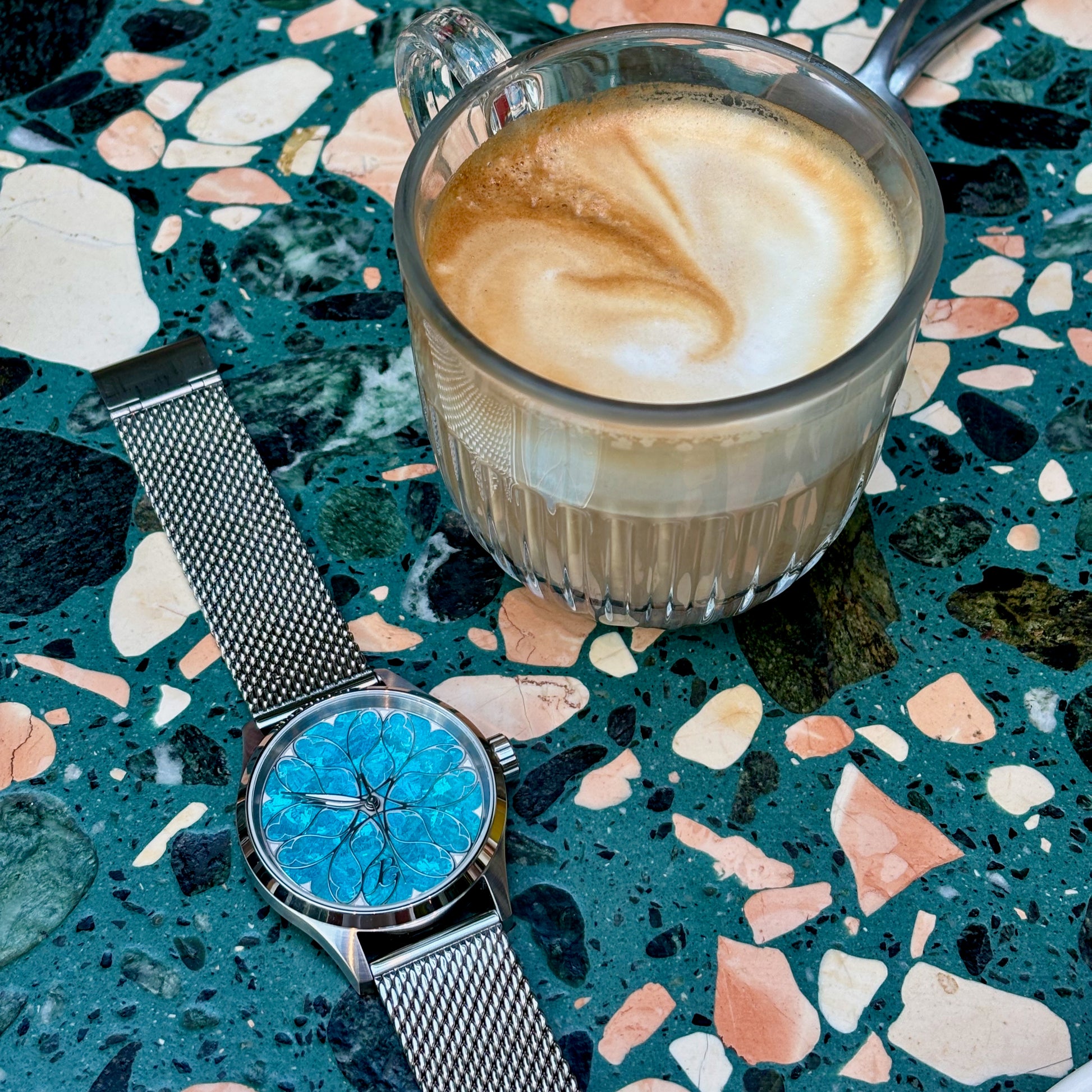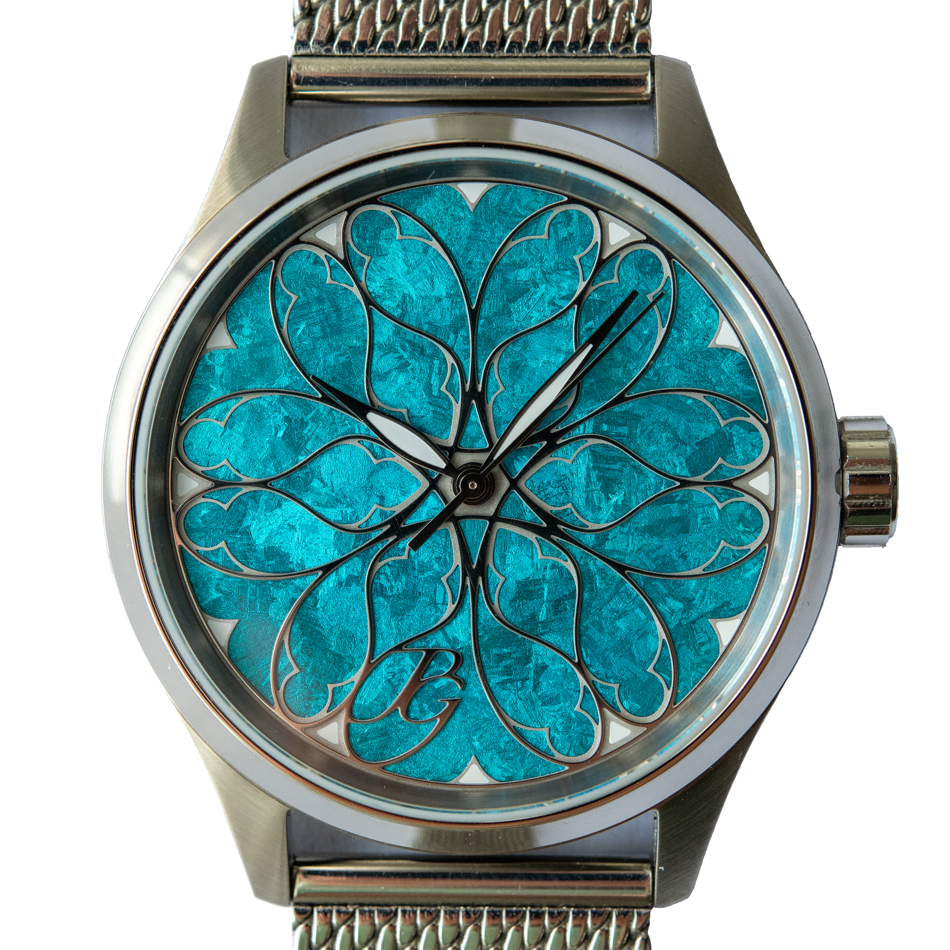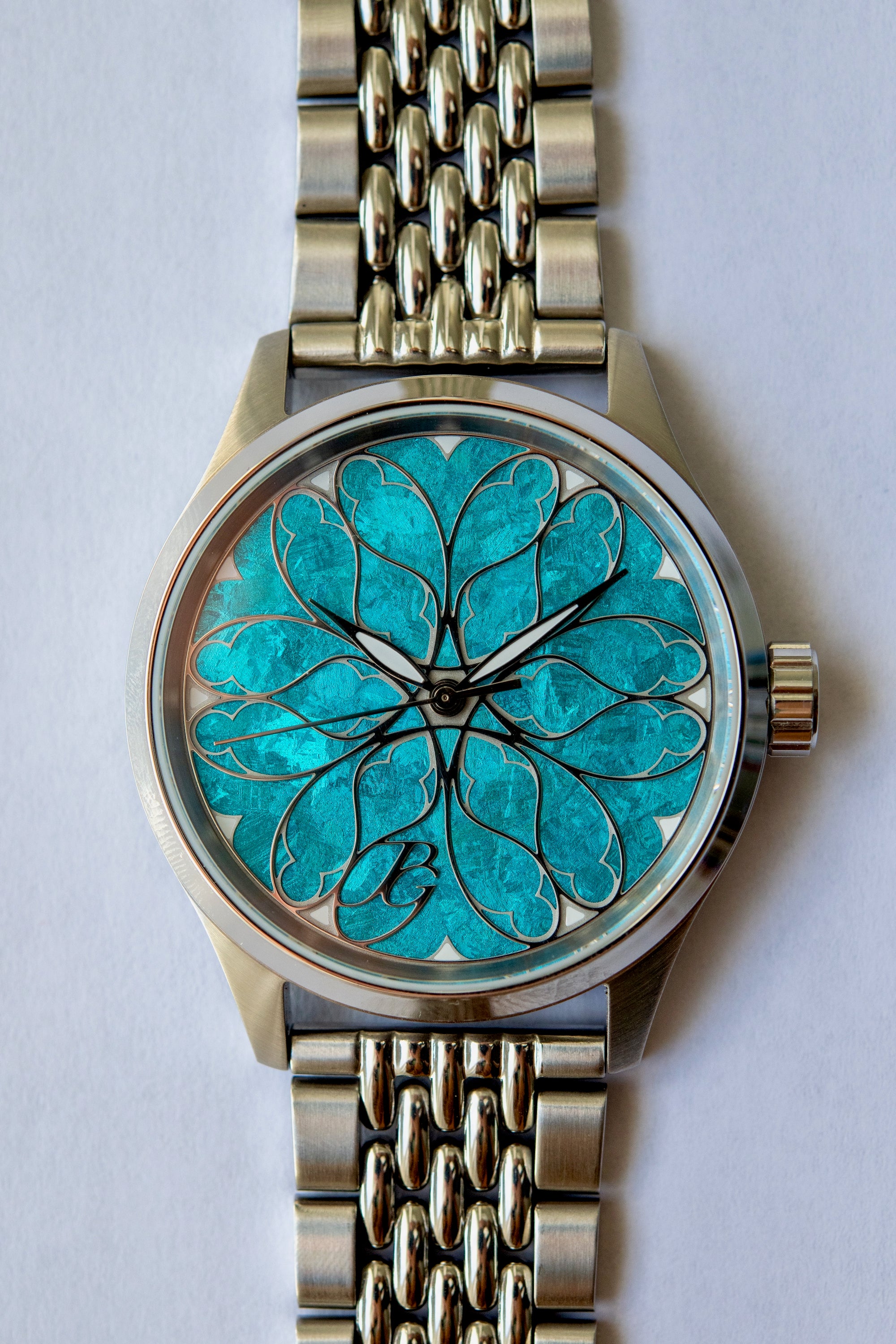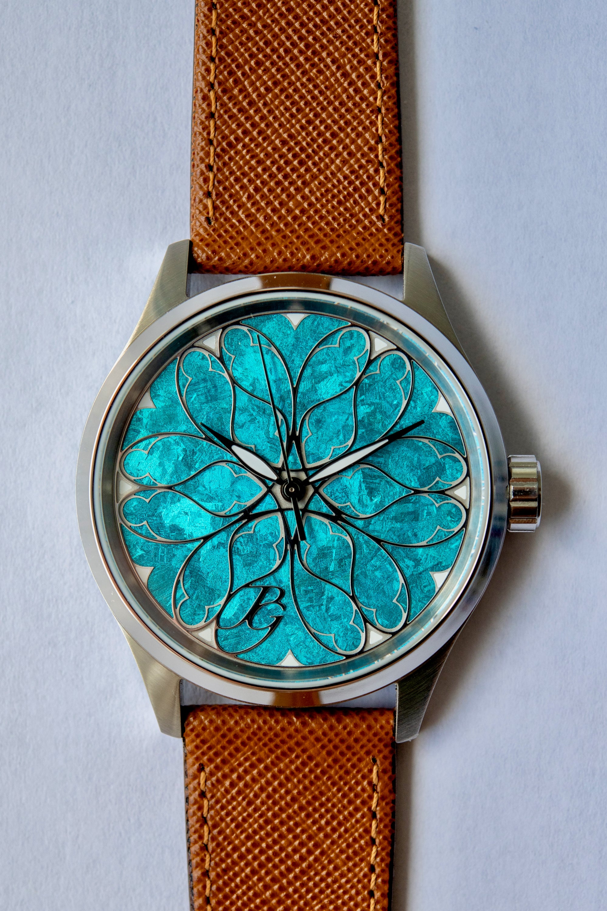 La montre Vincennes se caractérise par un cadran bleu céleste en titane anodisé. La surface cristallisée permet de jouer avec la lumière, révélant des reflets en perpétuel mouvement selon l’angle et la luminosité ambiante. Elle rappelle ainsi les jeux de lumière des vitraux.