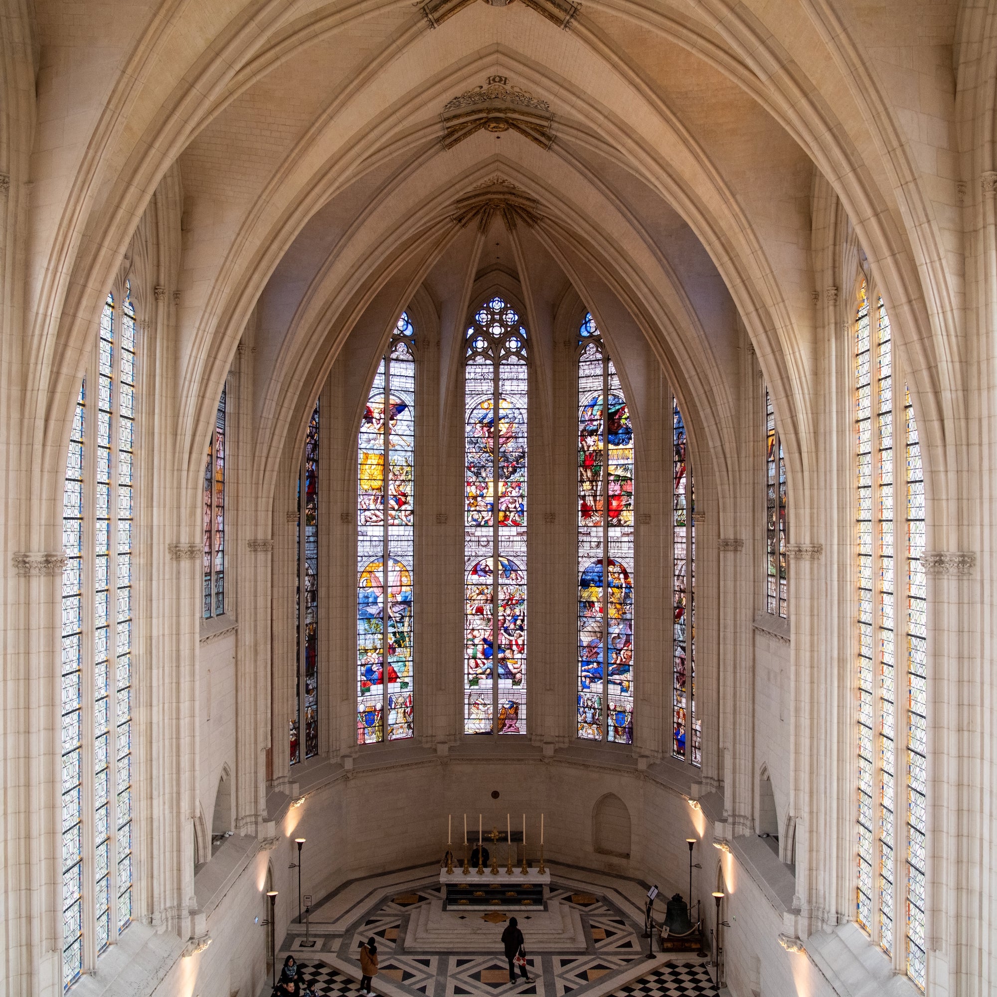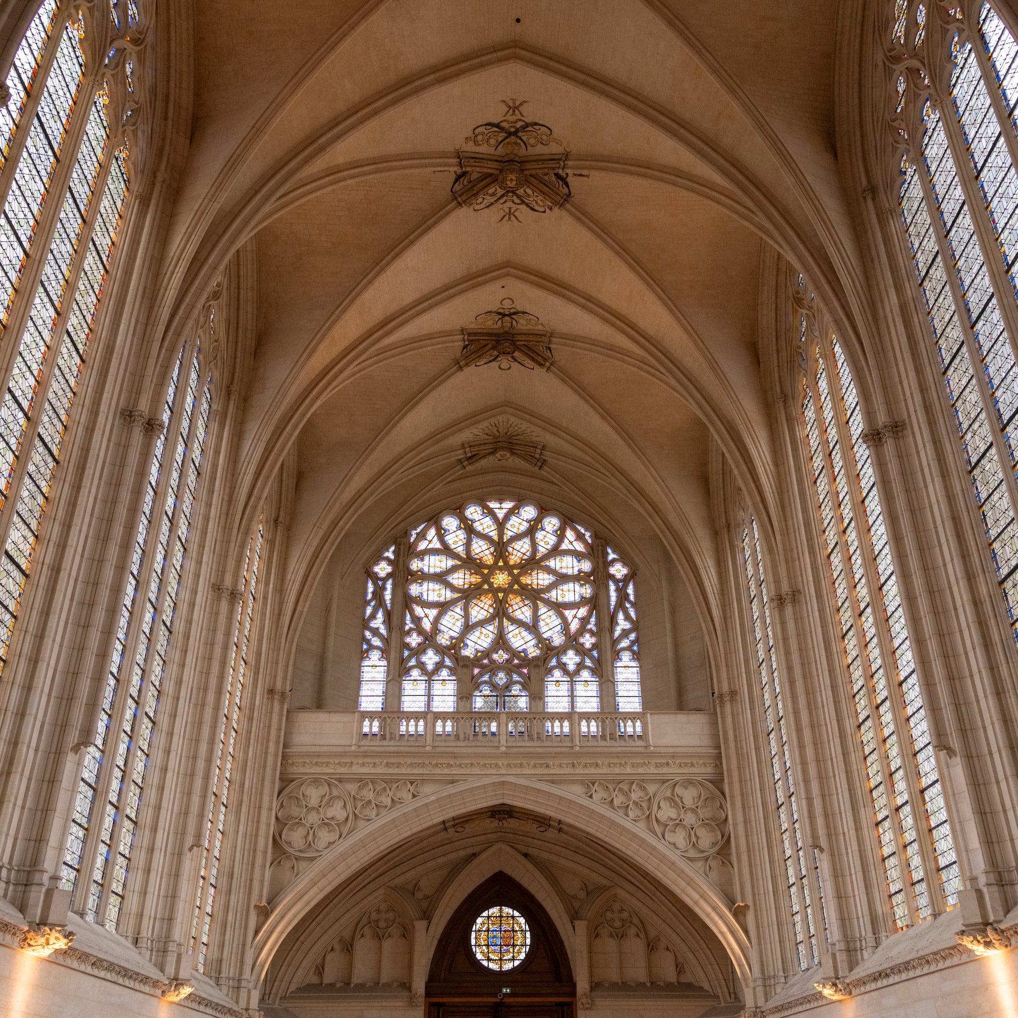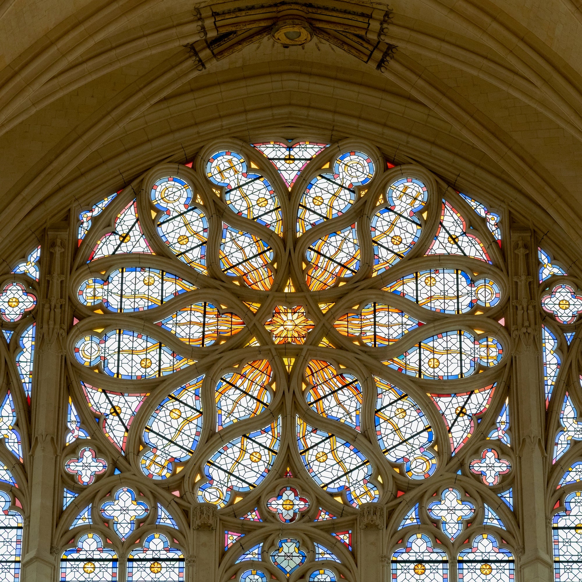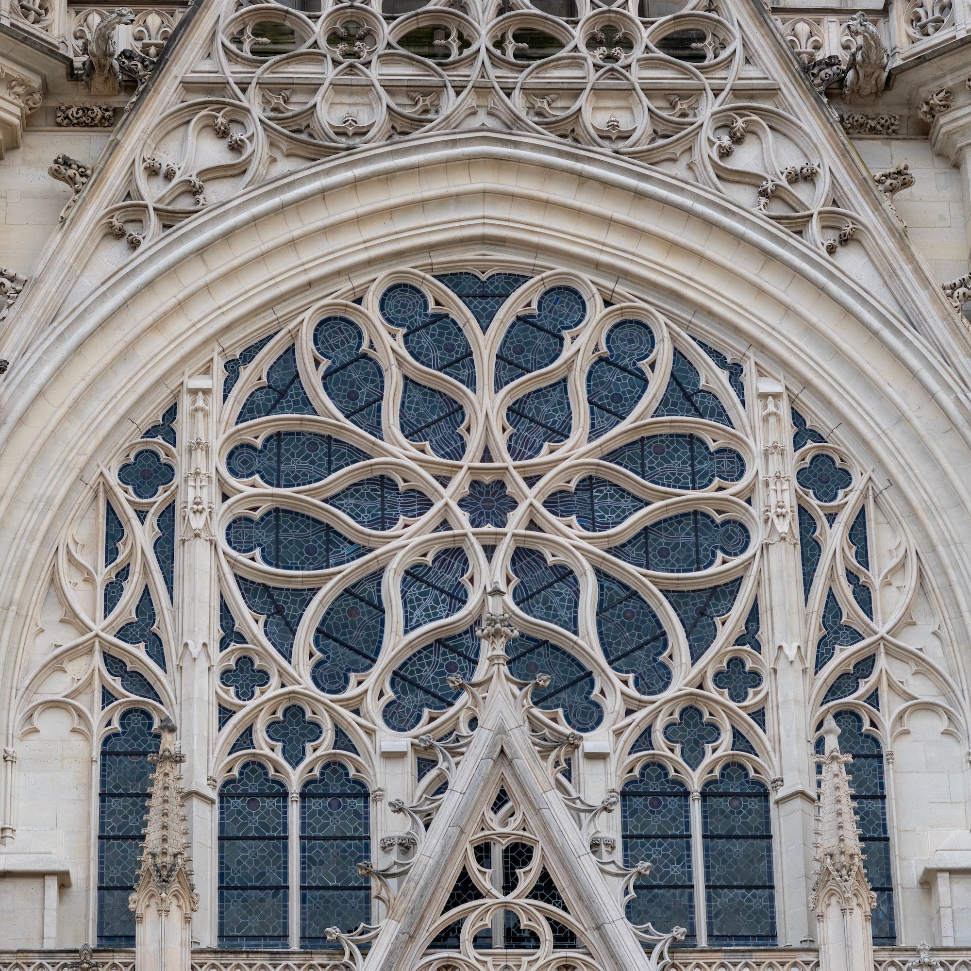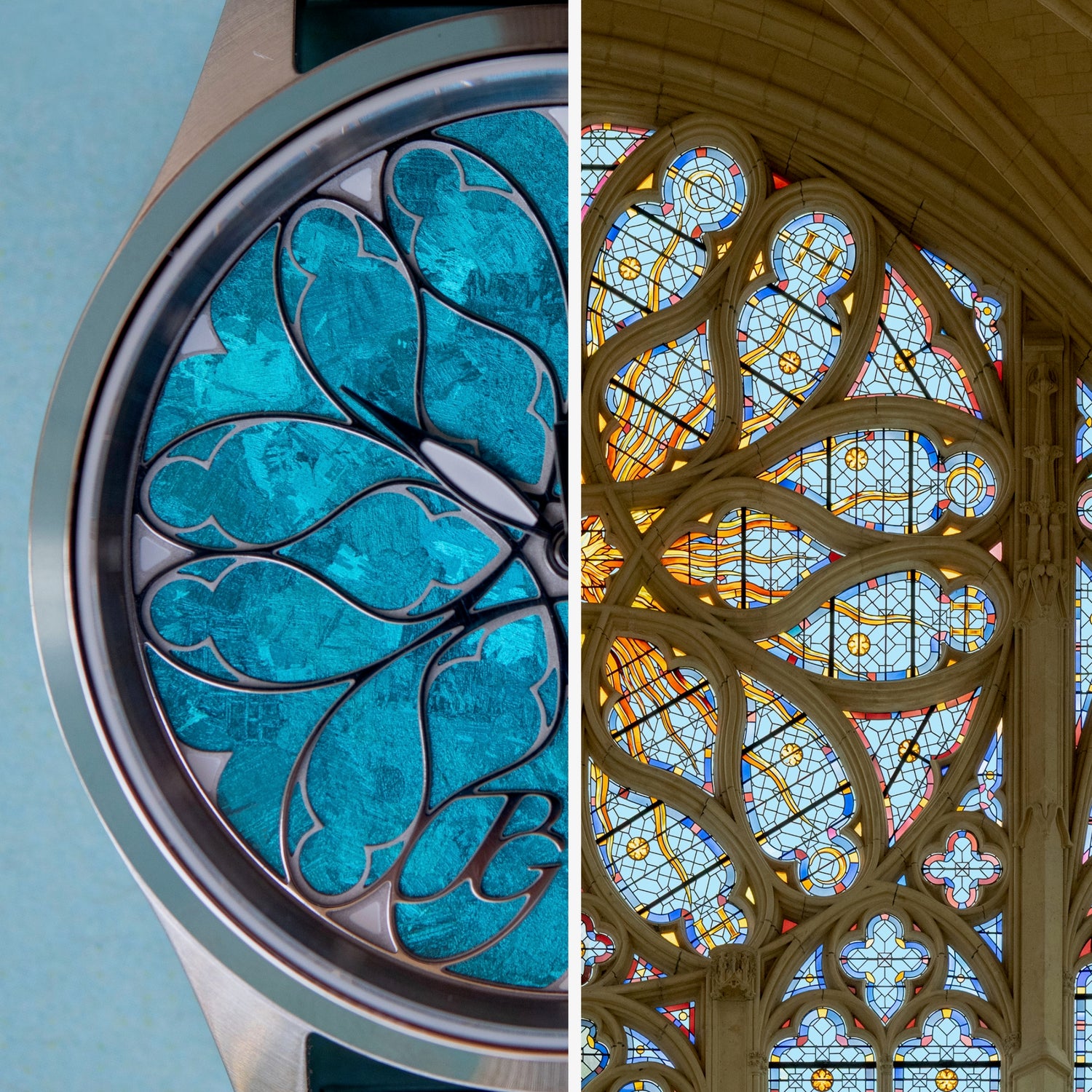 La rosace est matérialisée par un délicat maillage en acier inoxydable, alternant creux mats et arêtes polies à la main, pour un contraste de textures et de profondeur. Le dessin s’inspire aussi fidèlement que possible de l’architecture de la rosace de la Sainte-Chapelle du château de Vincennes. Vous trouverez ci-dessous davantage d’informations sur son histoire, sa construction et sa signification. Pour en faciliter la lecture, les heures sont marquées par des index blancs peints à la main.