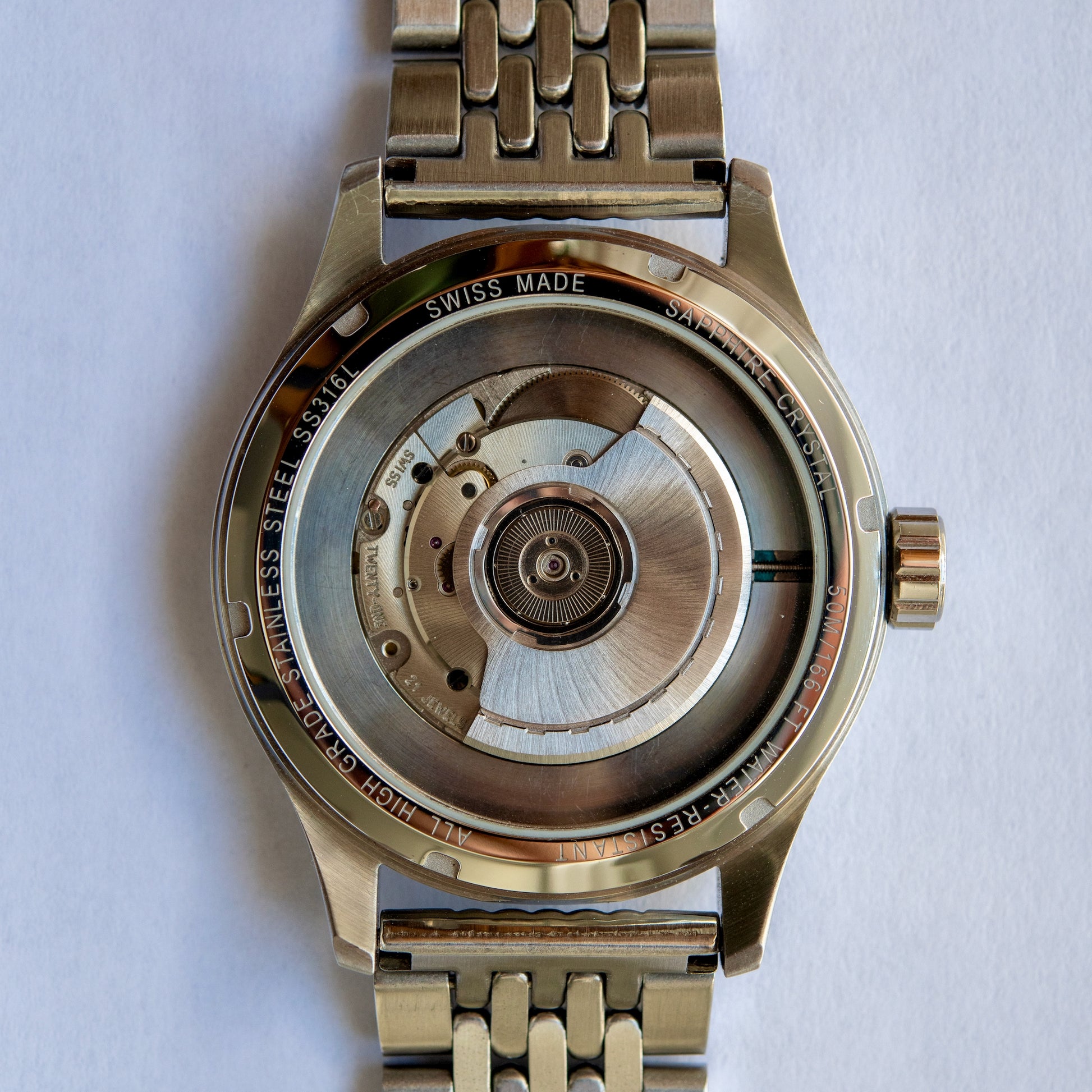 La montre est animée par un mouvement automatique suisse ETA 2892-A2, un calibre reconnu pour sa qualité et sa fiabilité. Sa compacité permet de contenir l’épaisseur de la montre à 11 mm, malgré un cadran trois fois plus épais que les standards habituels.